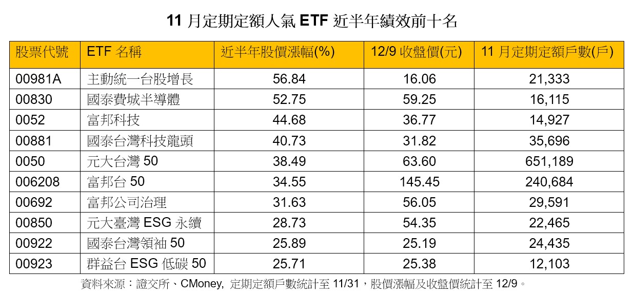 台股重新回到2萬8300點之上,台股ETF也維持熱度,以證交所公布的11月定期定額交易戶數20大ETF來說,絕大多數都是老面孔,近半年漲幅25%起跳。