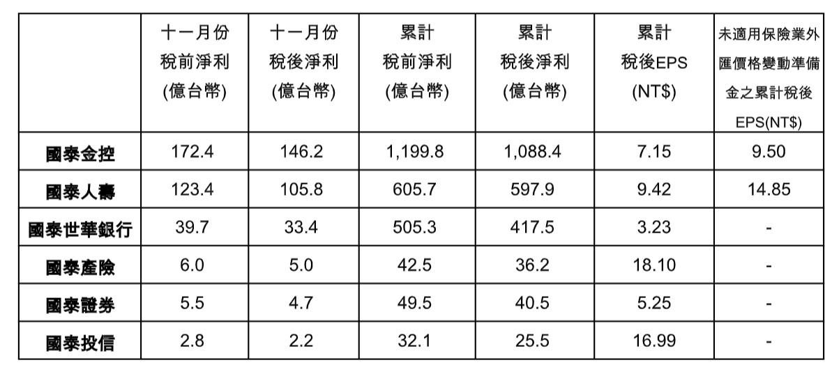 國泰金自結11月稅後淨利146.2億元,累計前11月稅後淨利1088.4億元,EPS達7.15元,持續保持金控獲利亞軍地位。