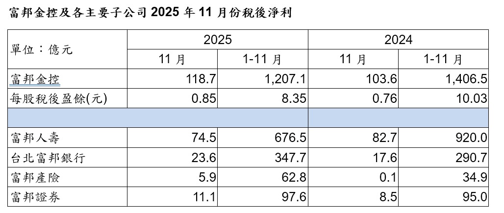 子公司台北富邦銀行、富邦產險、富邦證券單11月獲利皆創下歷年同期新高,富邦人壽亦為歷年同期次高;累計前11月獲利,北富銀、富邦證皆續創歷史同期新高紀錄,富邦產險亦為歷年同期次高。