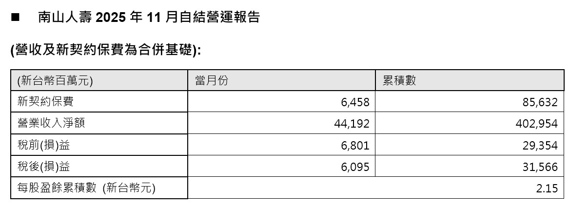 南山人壽指出,保險本業表現穩健,11月受惠於穩定的經常性收益及資本利得挹注;11月合併新契約保費65億,以投資型年金、理財型及高保障商品為銷售主力,加上持續推出符合國人醫療照護需求商品,整體醫療險商品動能穩健。