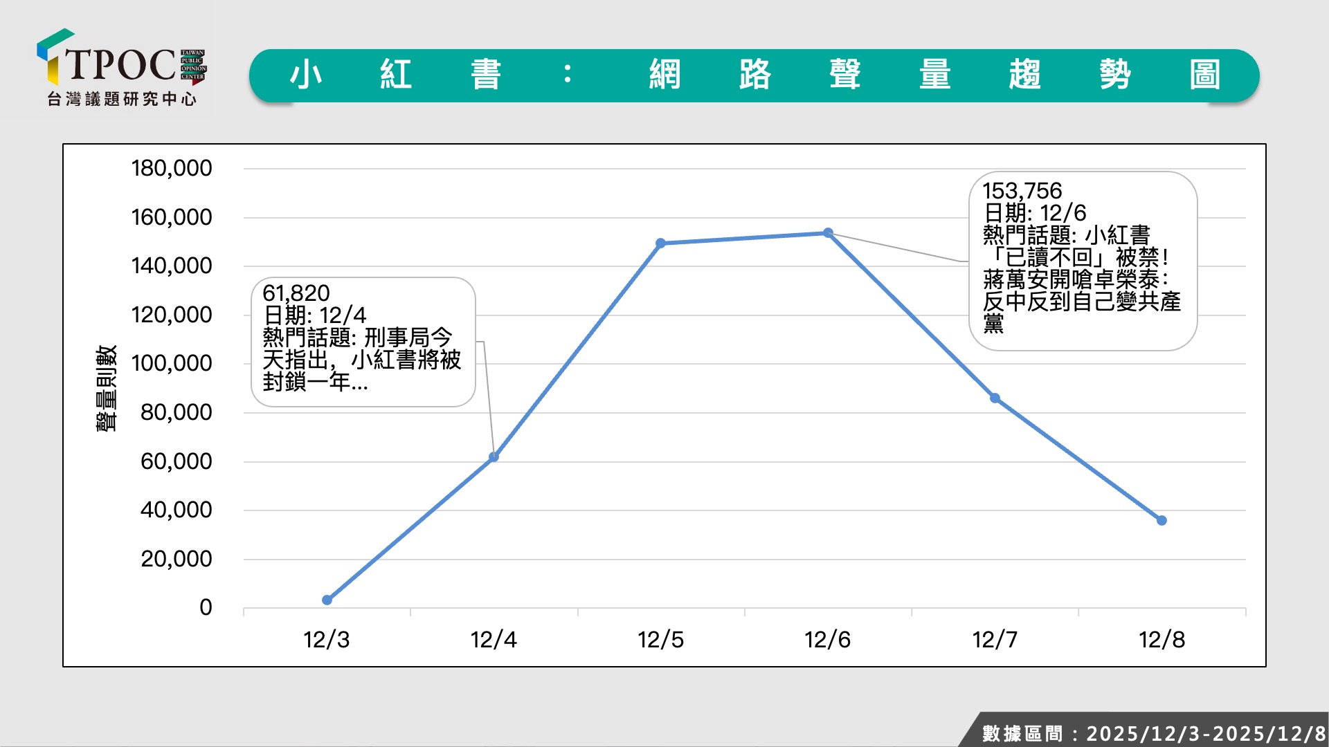 TPOC台灣議題研究中心透過QuickseeK快析輿情資料庫觀察發現,在12月3日至12月8日短短6天內,與小紅書有關的討論度高達逾49萬則,且在12月4日刑事局說明小紅書將被封鎖1年當天只有約6萬餘則,隔天就暴衝到14.9萬則,第三天聲量進一步衝高至15.3萬則,熱門話題例如台北市長蔣萬安受訪時便批評行政院長卓榮泰「反中反到自己變共產黨」,引發正反意見熱烈交鋒,也反映著在野黨趁議題發酵期間「撿到槍」,藉此批評執政黨對中立場,成為跨黨政治人物攻防熱點。