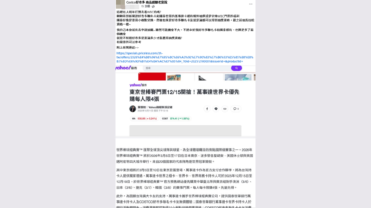 不過也有消費者詢問實際操作細節,像是好市多聯名卡的滿額門檻、是否需要額外登記、門票是否記名等問題。部分網友則考慮直接購買旅行社的WBC包套行程,認為自行搶票難度太高。整體而言,這波信用卡福利確實為想看WBC的球迷增加了新的選擇管道。