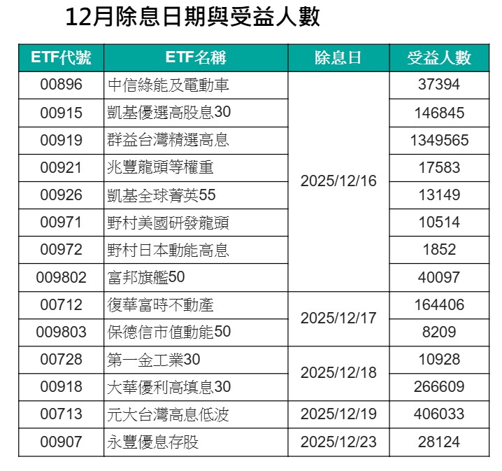 想參與2025年最後一波ETF除息嗎?12月即將除息的股票型ETF共有14檔,熱門除息日集中在12月16日至18日,包括保德信市值動能50 ETF(009803)、凱基優選高股息30ETF、群益台灣精選高息ETF(00919)、大華優利高填息30ETF(00918)等熱門ETF,都將於這段時間除息,預計將有逾200萬受益人共襄盛舉。