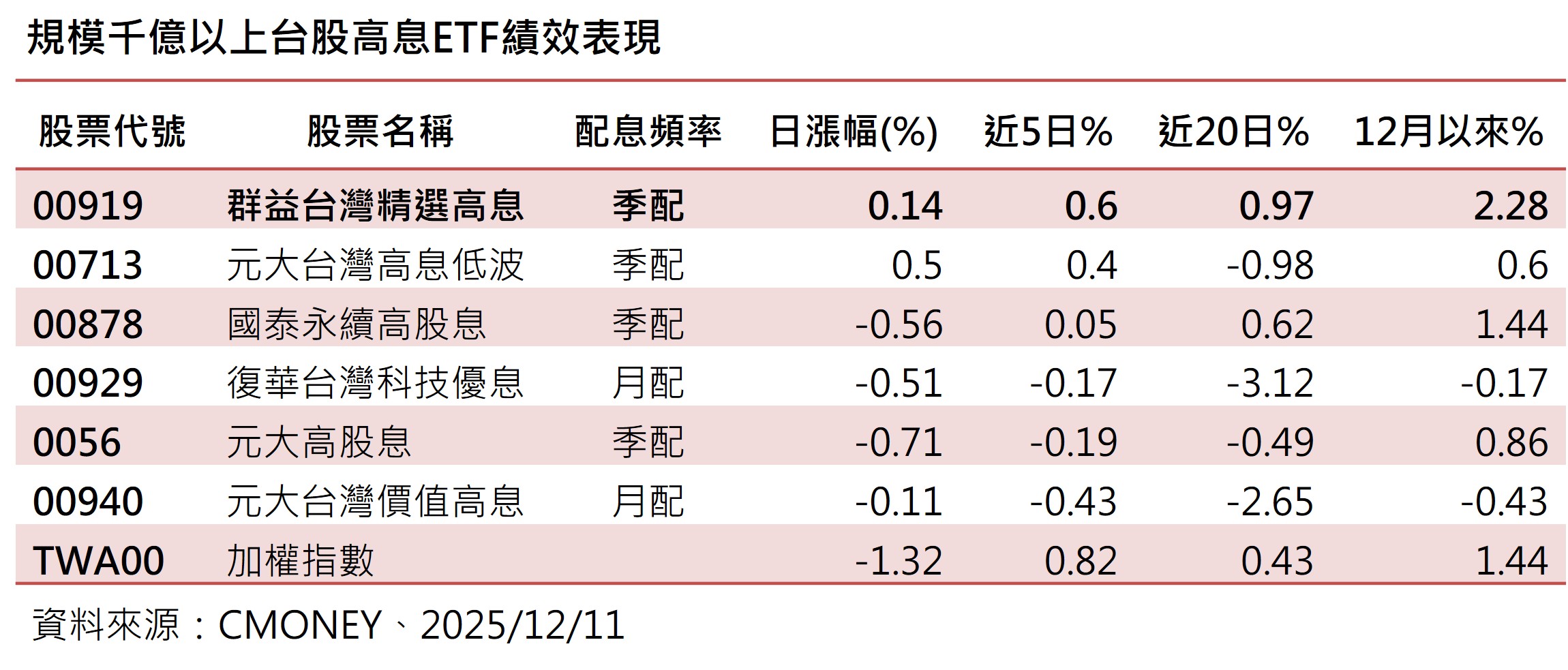 另外,00919也是規模千億以上的台股高息ETF當中,12月以來仍維持正報酬的標的。另外3檔正報酬的人氣高息ETF,包括元大台灣高息低波(00713)、國泰永續高股息(00878) 、元大高股息(0056)。