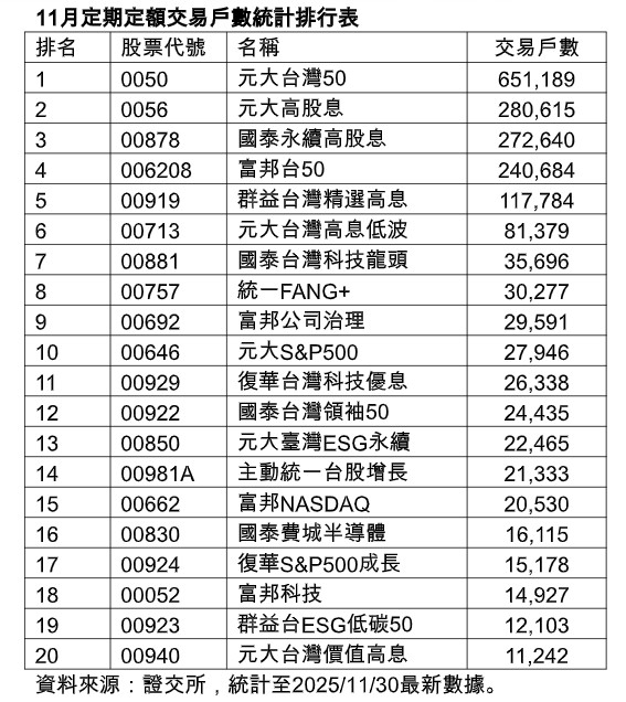 群益台灣精選高息(00919)也持續受到投資人青睞,11月定期定額交易戶數名列第五大。