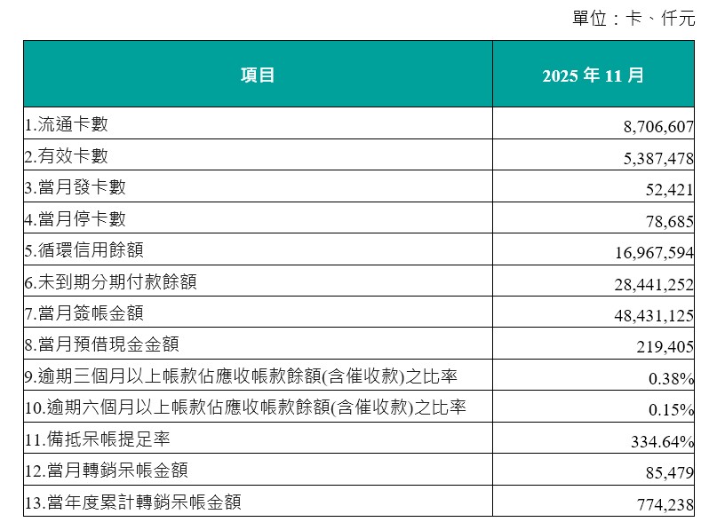 玉山信用卡業務持續穩定增長,流通卡數871萬張,較去年同期成長16.3%,有效卡數為539萬張,較去年同期成長8.8%,11月新發卡數為5.2萬張,主要發卡動能來自玉山Unicard、熊本熊卡、U Bear等。