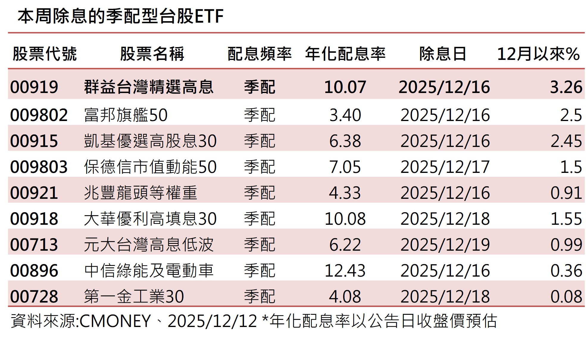 群益台灣精選高息ETF(00919)基金經理人謝明志表示,在降息利多與季節性因素帶動下,台股雖短線震盪,但中期仍維持偏多結構,整體而言,年末行情仍需在震盪中掌握節奏,維持穩健配置以提高勝率,台股高息ETF就是穩健投資首選。
