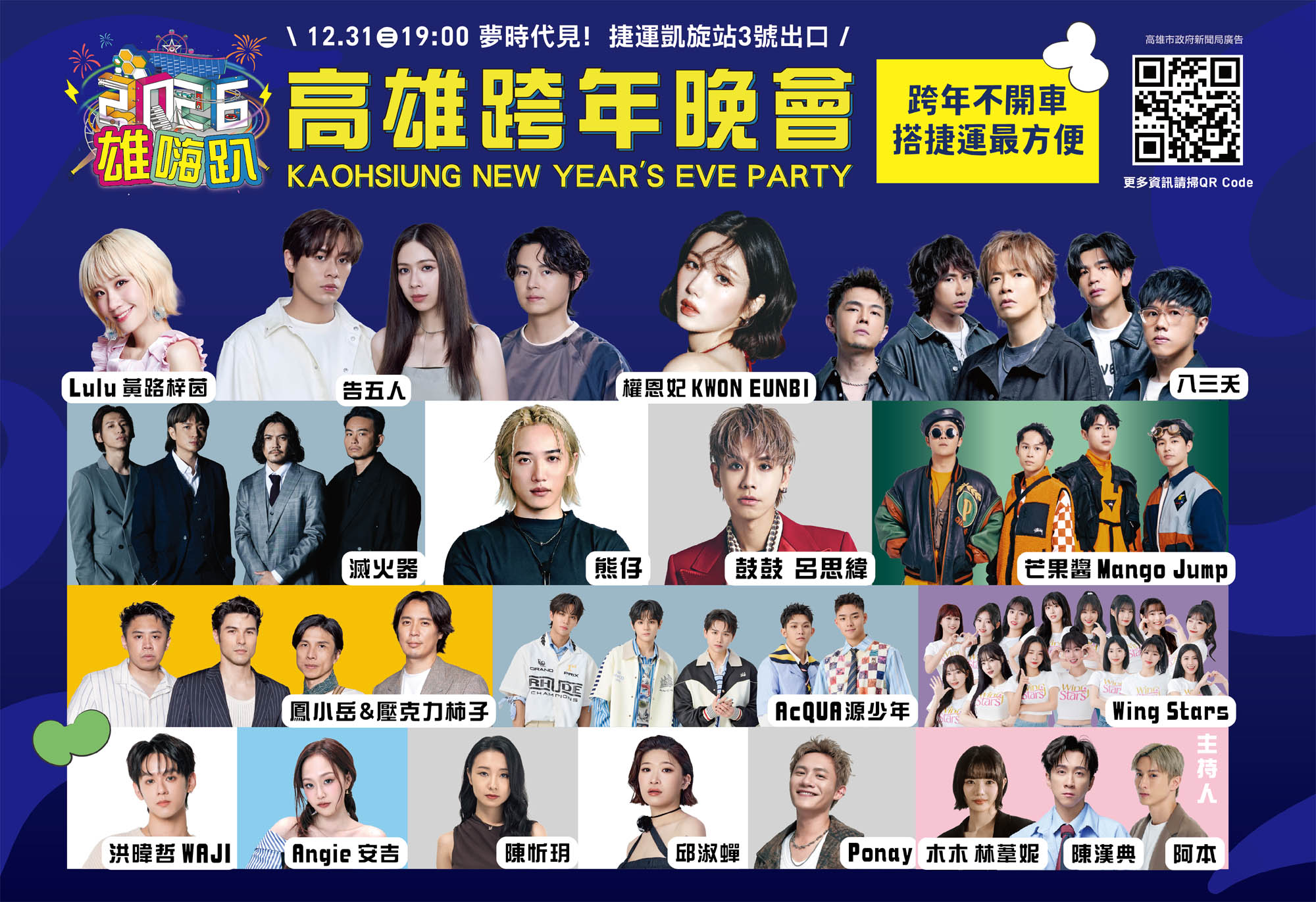 今年跨年舞台星光熠熠,包括告五人、八三夭、滅火器、熊仔、鼓鼓呂思緯、芒果醬、鳳小岳與壓克力柿子、AcQUA源少年、陳忻玥、邱淑蟬、Ponay、洪暐哲、安吉及Wing Stars等輪番演出,主持人則由陳漢典、阿本與木木擔綱。其中,陳漢典與Lulu黃路梓茵婚後首度同台跨年,也成為粉絲熱議焦點。