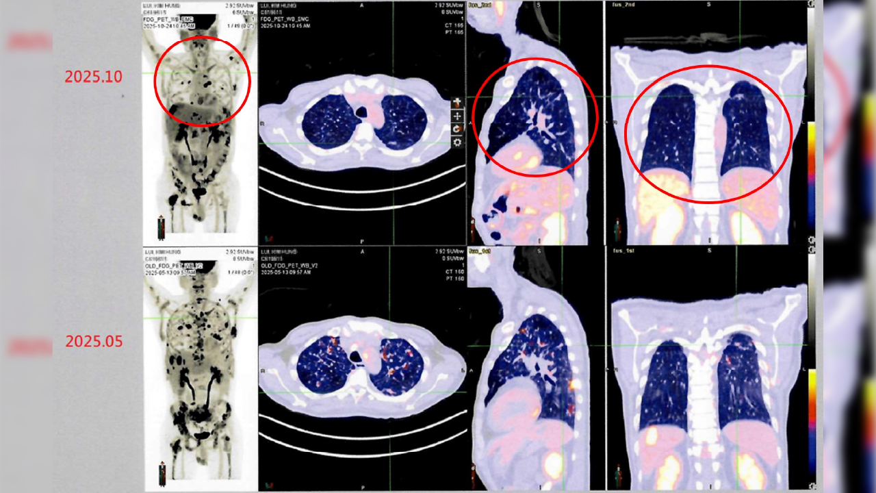 衛生福利部雙和醫院有位來自香港的男性病患(50歲)。他於2024年在香港被診斷出罹患第四期肺癌,歷經多次傳統化療與標靶治療後,為尋求新的治療機會,他評估後決定來台灣進行自體免疫細胞治療(DC-CIK)。經過半年整合療程後,最新影像檢查顯示病情穩定,疼痛症狀明顯獲得緩解,體能與生活品質大幅提升。