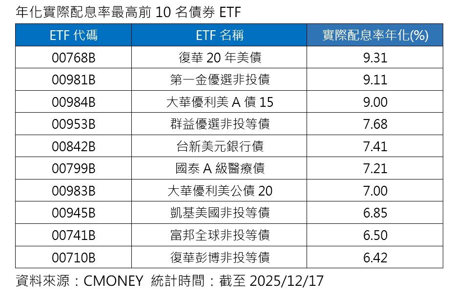 CMONEY統計,年化實際配息率最高前10檔債券ETF,其中有3檔年化實際配息率至少9%起跳,包括復華20年美債(00768B)、第一金優選非投等債(00981B),以及大華優利美A債15(00984B)。