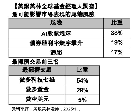 擁擠交易方面,「做多科技七雄」兩個月霸榜最擁擠交易第一名,其次為做多黃金與放空美元,此外,最可能引發信用危機事件的風險來源為私募股權/債券。