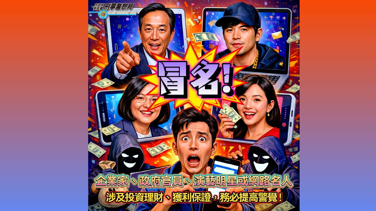 刑事警察局強調:任何冒用本局官警或其他政府官員名義進行商業宣傳、投資推薦者,均屬詐騙行為,刑事局將全力追緝到底,絕不寬貸,此類詐騙不僅侵害民眾財產,更嚴重損害政府公信力,本局已全力偵辦。政府機關及執法人員職責為維護治安、打擊犯罪,絕不可能介入或推薦任何民間投資活動。無論冒名對象是企業家、政府官員、演藝明星或網路名人,只要涉及投資、理財、獲利保證,務必提高警覺,如發現疑似詐騙訊息,請立即撥打 165 專線,切勿因貪念而落入詐騙陷阱。