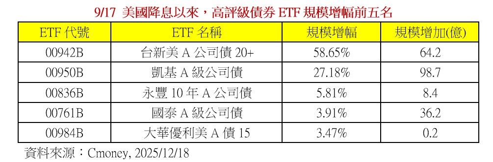據統計,9月17日,美國啟動此波降息以來,投資級債券ETF規模增幅前五大,包括00942B、00950B、00836B、00761B、00984B,其中,00942B規模大增逾6成居冠。