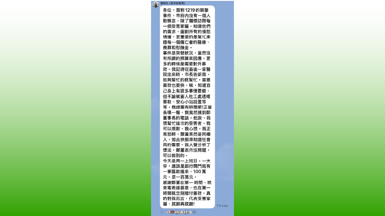 局長姚淑文在友人的line群組表示,面對1219的襲擊事件,市府沒有一個人敢懈怠,除了關懷訪問每一個受害家屬,知道他們的需求,更重要的是幫忙承擔每一個傷亡者的醫療、喪葬和慰撫金。事件是突發狀況,沒有所謂的預算來因應,更多時候需要對外募款。她記得從最後一家醫院出來時,市長指示能夠幫忙的就幫忙,需要募款也要快。