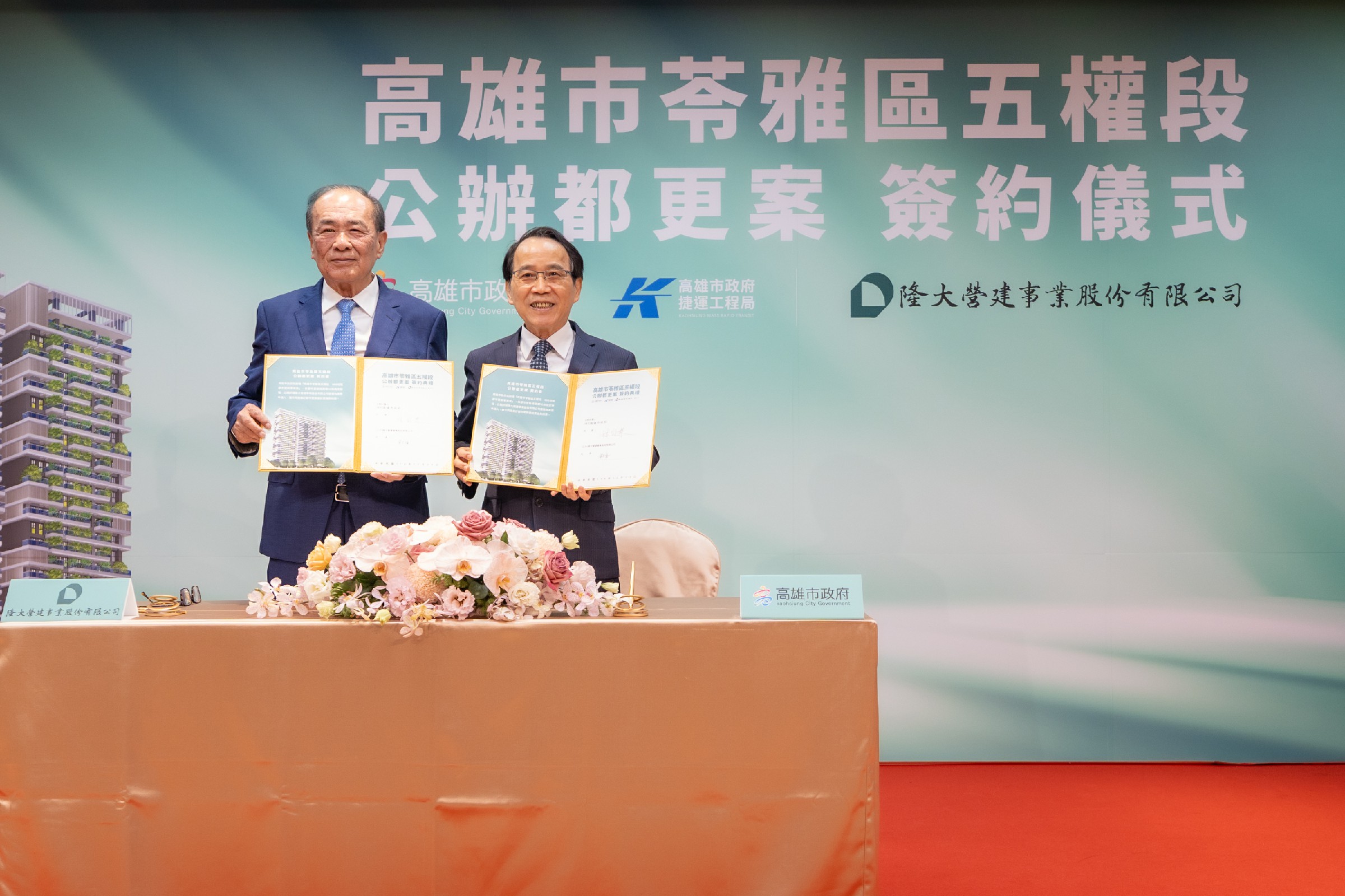 ↑圖說:高市府與隆大營建事業公司舉行苓雅清潔隊公辦都更案簽約儀式。(圖片來源:高雄市捷運局提供)