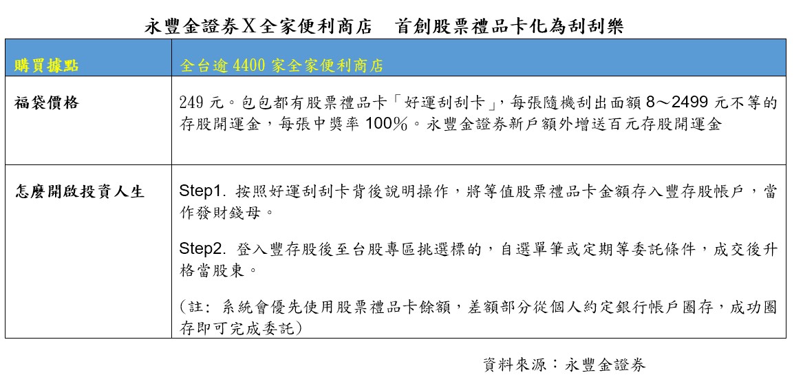 永豐金證股票禮品卡化身「好運刮刮卡」!裝入全家福袋賣 最高十倍奉還