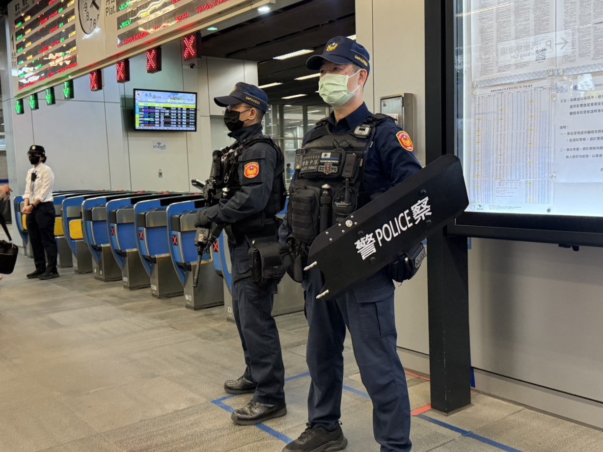 ↑圖說:高市警局針對大眾運輸重要樞紐,由保安警察大隊員警全副武裝持手臂盾牌及長槍執行守望。(圖片來源:高雄市警察局提供)