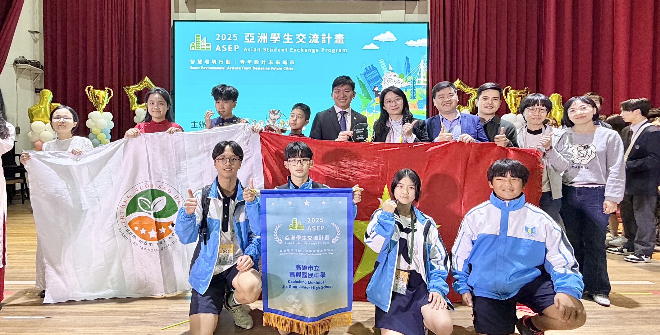 高雄市立嘉興國中與越南河內星星中學跨國合作組隊,參與「2025亞洲學生交流計畫(ASEP)」,以「青年設計未來城市」為主題,融合科技創意與永續行動,從85所亞洲參賽學校中脫穎而出,勇奪大會最高榮譽「白金獎」,展現臺灣學子卓越的國際合作力與前瞻視野,再次讓世界看見臺灣、看見嘉興。