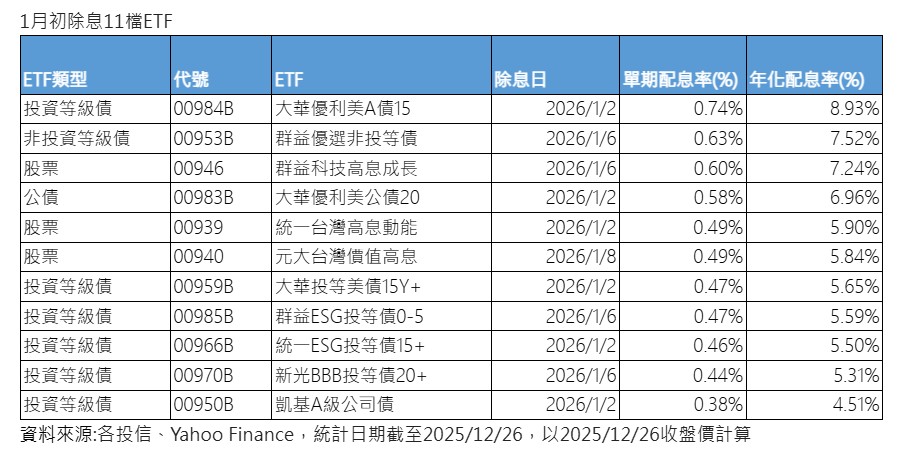 新年首批除息ETF出列!統計明(2026)年1月初將有11檔ETF登場除息,包括8檔債券型ETF、3檔股票型ETF,其中以(00984B)大華優利美A債15年化配息率8.93%最高,而且將在元月2日率先除息,投資人若想要參與收益分配,最後買進機會只剩今(31)天。
