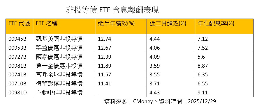 法人觀察成立一年以上的6檔被動型非投等債ETF,近半年的含息報酬率皆站上雙位數。其中,市場上唯一專注美國非投等債ETF的凱基美國非投等債(00945B)以12.74%的含息報酬率登頂;而下半年主動式非投等債ETF加入戰場,7檔掛牌非投等債ETF近三個月表現亦紛紛繳出3%~4%的成績單。