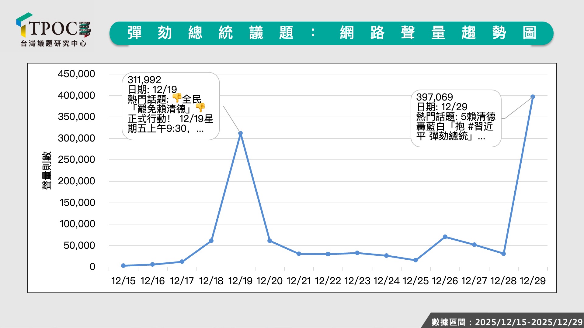 根據TPOC台灣議題研究中心透過QuickseeK快析輿情資料庫,蒐集12月15日至12月29日之間關於彈劾議題的網路輿情數據。調查期間內每日平均聲量落在7.6萬則左右,其中,第一個聲量高峰出現在12月19日,當日熱門話題為國民黨立法院黨團發動「全民罷免賴清德」行動,創下超過31.1萬則聲量高峰,不過這股強勁聲量並未延續到隔天,直到賴清德接受電視媒體專訪釋出後,引發在野黨強烈不滿,如民眾黨主席黃國昌便要求限時24小時道歉相關新聞也成單日熱門話題,當天聲量超過39.7萬則,顯示在總統親上火線發言後,讓彈劾議題聲量進一步躍升。
