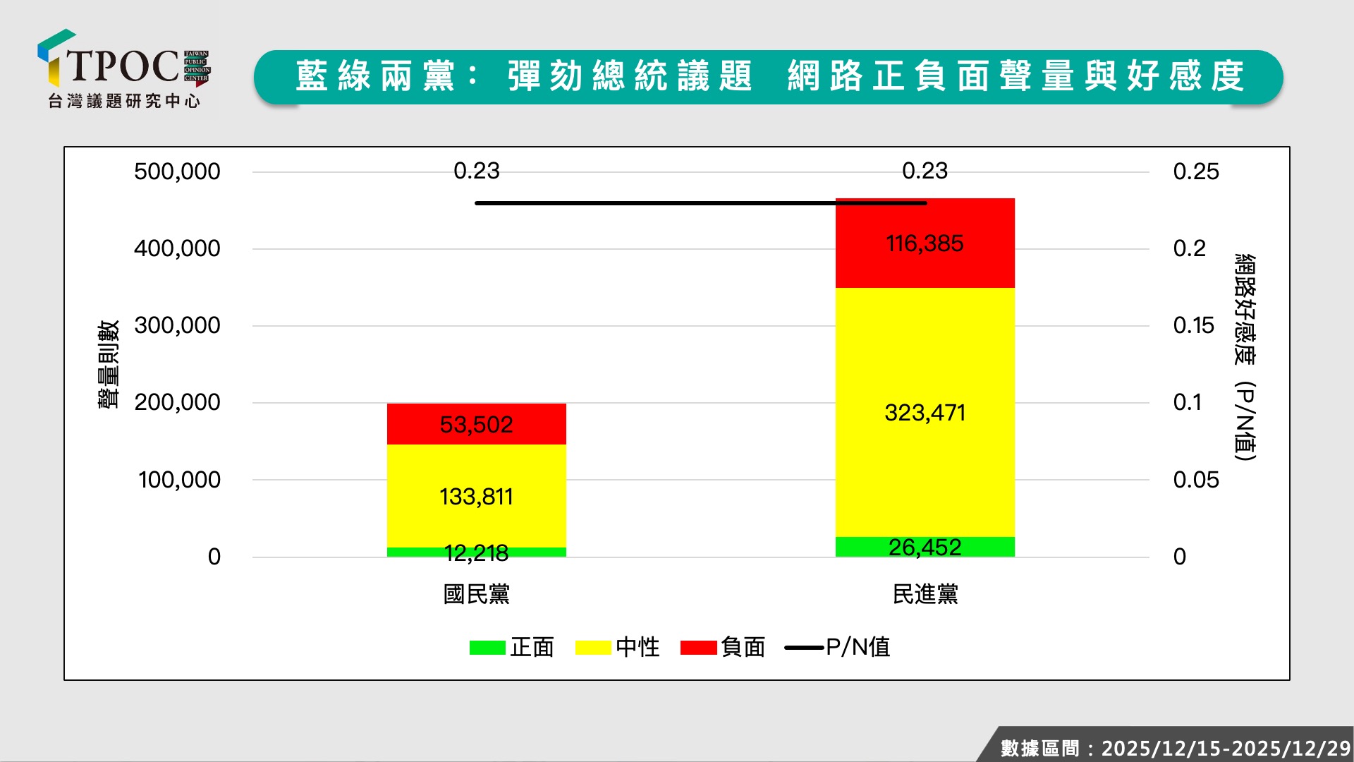 有趣的是,觀察網路正負面聲量與好感度發現,藍綠兩大陣營在此議題的好感度都是0.23,打成平手,而在總聲量方面,民進黨相關總聲量高達46.6萬則,國民黨總聲量約19.9萬則。在主要議題方面,藍軍將「憲政崩壞」作為主訴求,批評不副署、不公布法律的作法是毀憲亂政、踐踏台灣人民,綠軍則「以子之矛,攻子之盾」,如府院黨均引述藍白「反帝制、反專制、反獨裁」的批評,反問「那敢反習近平與普丁嗎?」並質疑在野黨彈劾總統是配合中共操作、擁抱習近平。整體而言,此次彈劾議題屬於典型的政黨對抗,雙方均聚焦鞏固核心支持者、抨擊政敵,論述上並沒有出現明顯交集,好感度也同樣偏低。