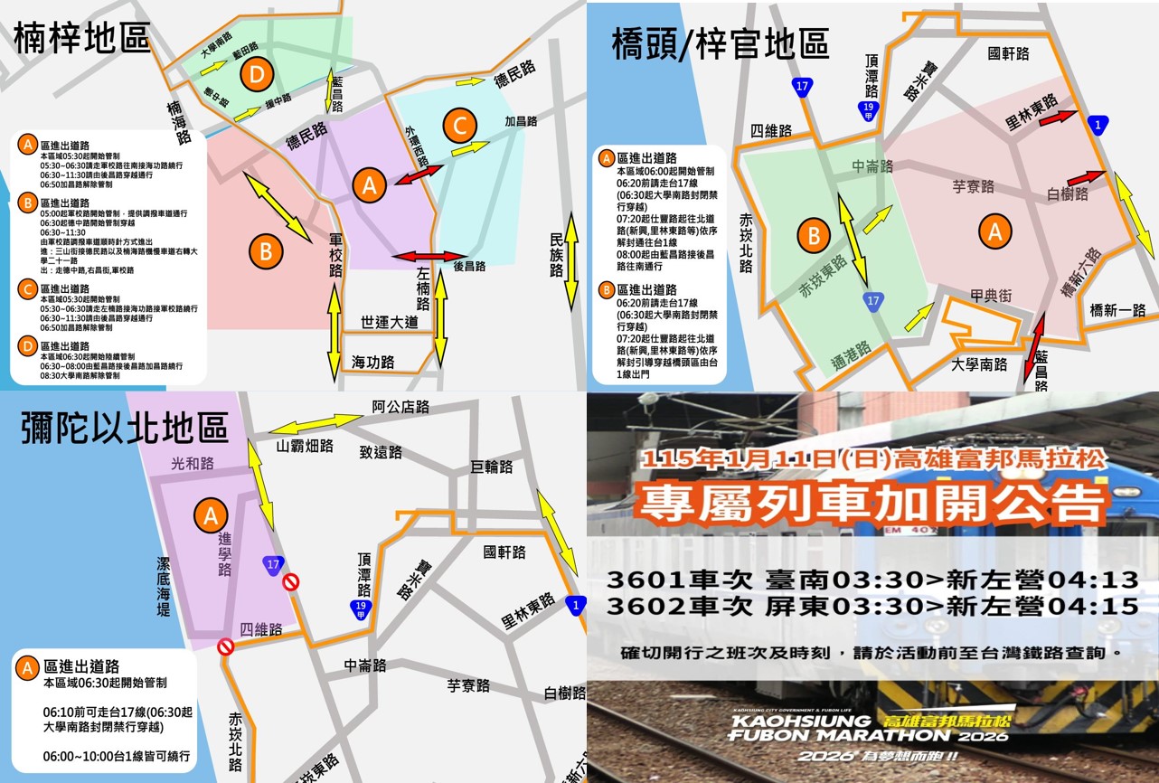 「2026高雄富邦馬拉松」將於115年1月10、11日(週六、日)上午在國家體育場及相關行政區道路盛大舉行,將吸引上萬名跑者齊聚高雄,本次高雄富邦馬拉松賽道迎來重大更新,首次往北延伸至橋頭、岡山與彌陀區,為確保賽事順利進行及參賽選手與市民行車安全,高雄市政府將於賽事期間針對部分路段實施階段性交通管制,運發局侯尊堯局長表示,請市民朋友提早規劃行程及配合改道,並提醒市民可多加利用大眾運輸工具,避開交通管制路段,行經賽事區域,耐心配合警方指引,禮讓選手通過,共同打造友善的馬拉松路跑環境。