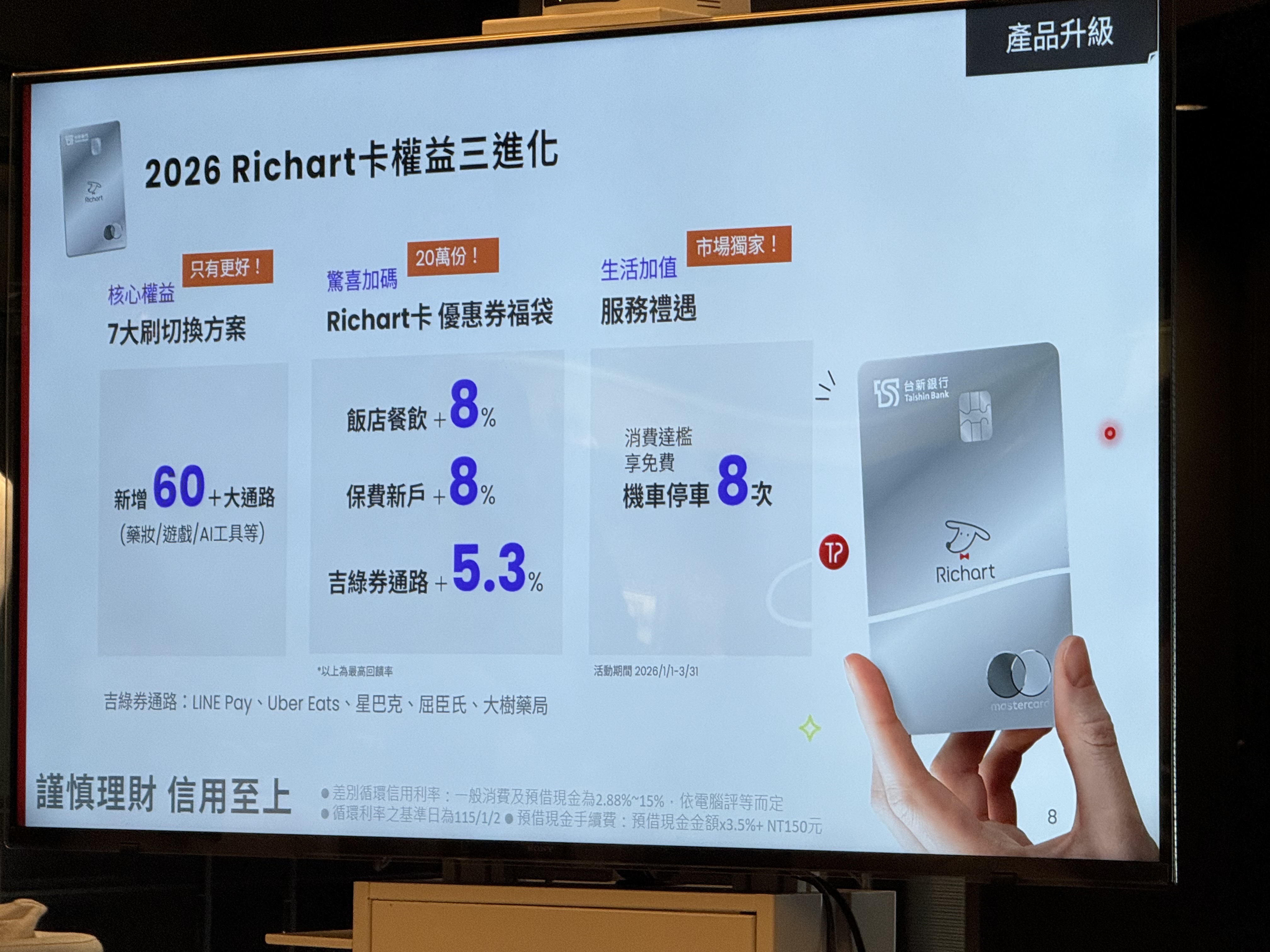 其次是推出Richart優惠券福袋,「吉綠券」到LINE Pay等5大通路最高5.3%回饋,針對飯店餐飲提供最高8%回饋,保費最高8%回饋,新戶申辦更享有不限通路最高10%點數回饋或精選行李箱首刷禮。