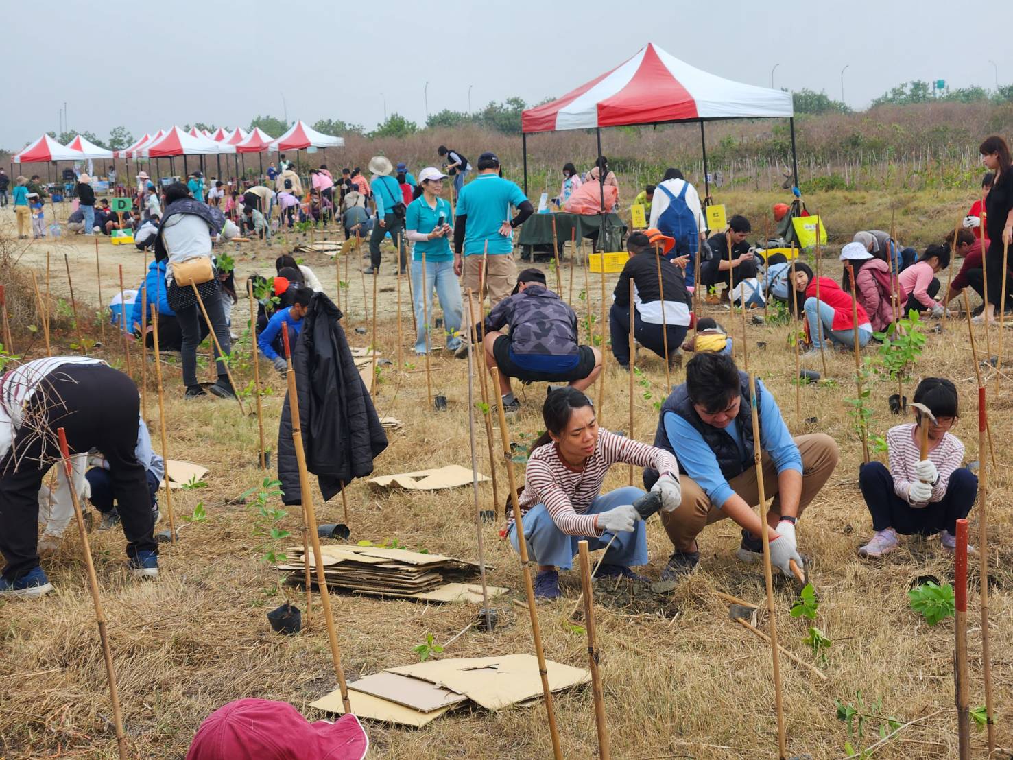 ↑圖說:參與師生在開闊地整齊排開,合力將苗木植入土中(圖片來源:高雄市工務局提供)