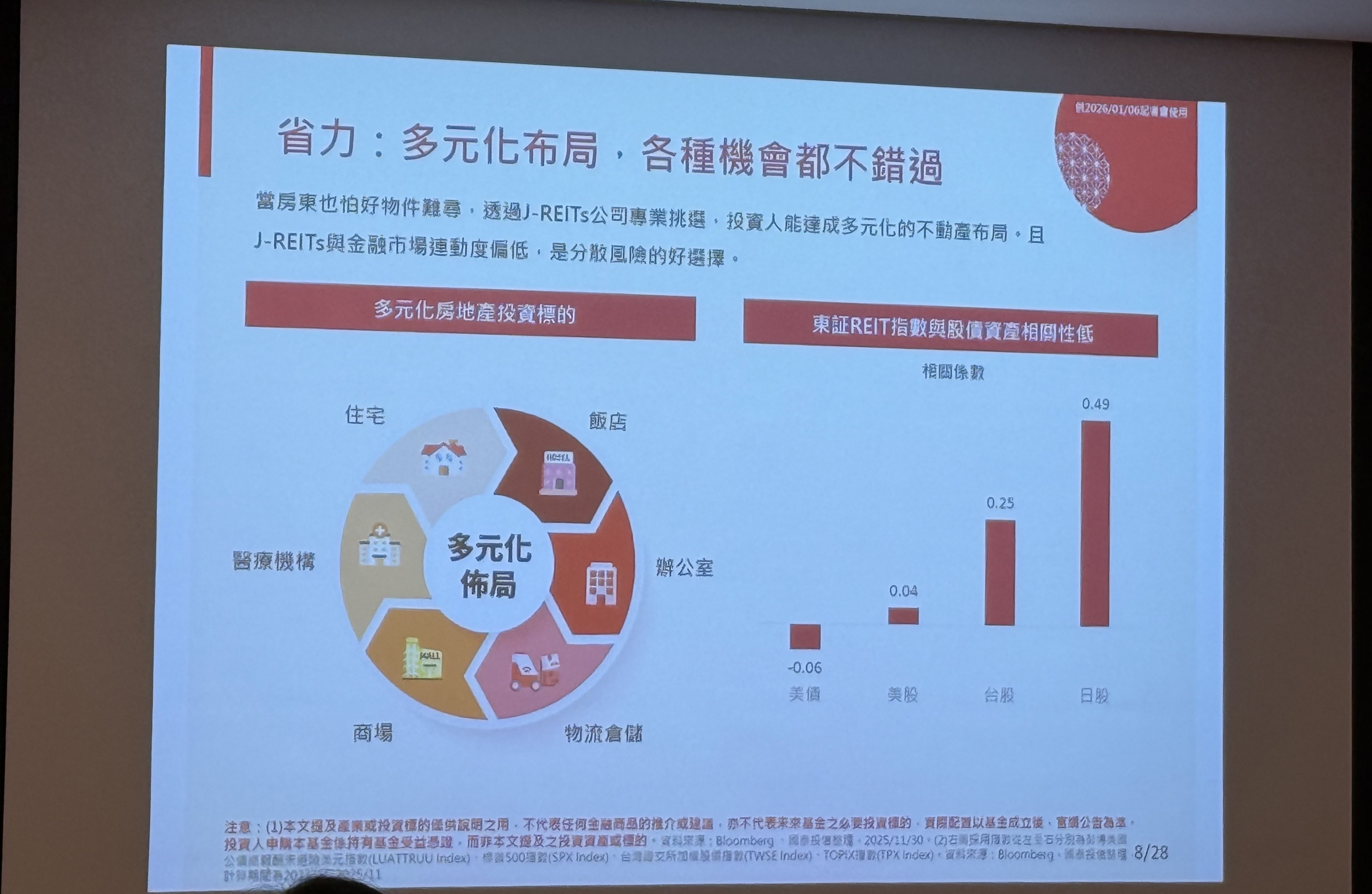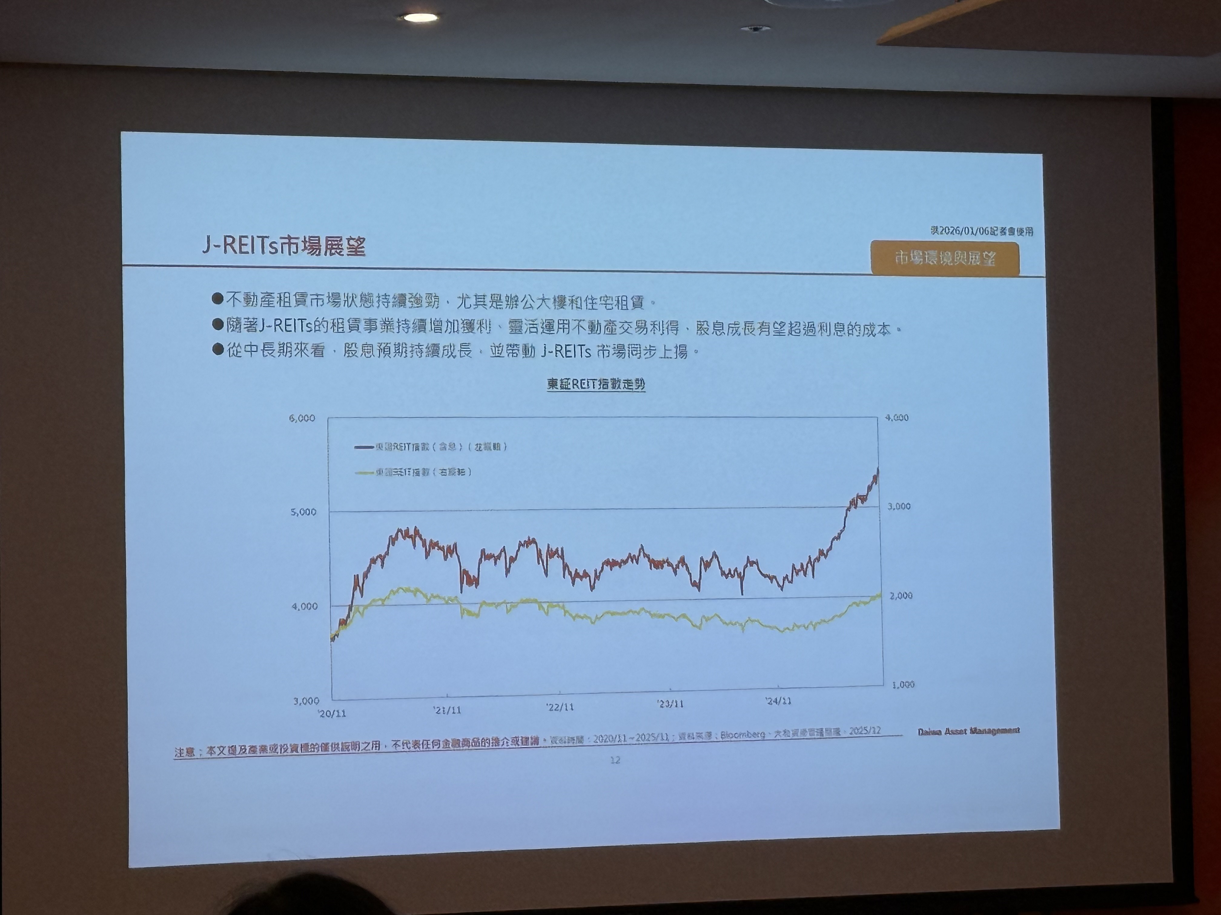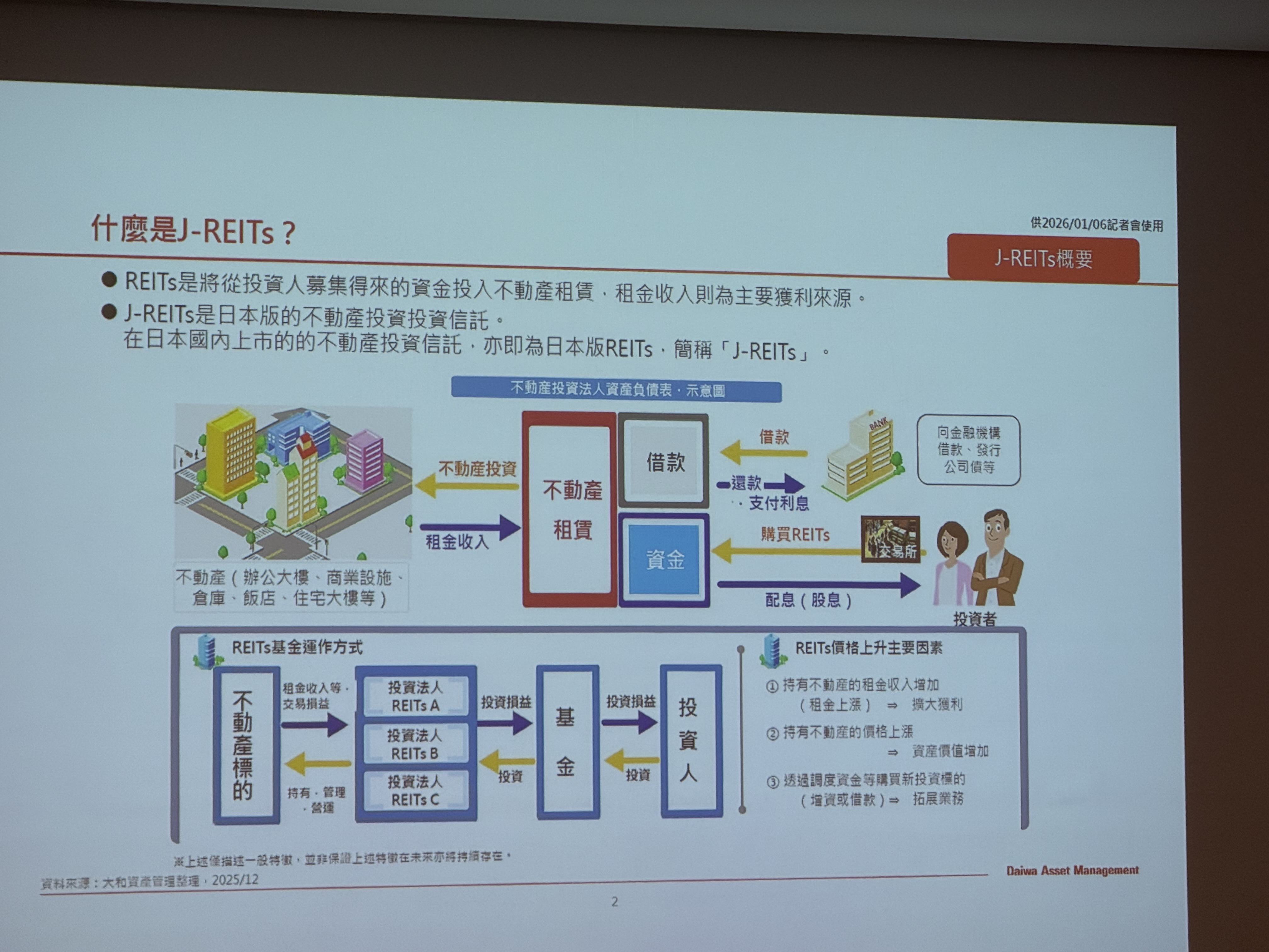 日本大和資產管理執行董事永島俊太郎指出,2025年是日本經濟與政治的重要轉折年,高市早苗去年10月就任首相後,成為日本首位女首相,日經平均指數突破5萬點,企業獲利屢創新高,活絡不動產市場,辦公室與商業設施租金隨通膨上升,幅度大於日本央行升息影響,東京核心區空置率降至2.44%,日本不動產投資信託基金(J-REITs)也會直接受惠;東証REIT指數回升至2000點以上,顯示市場需求強勁。
