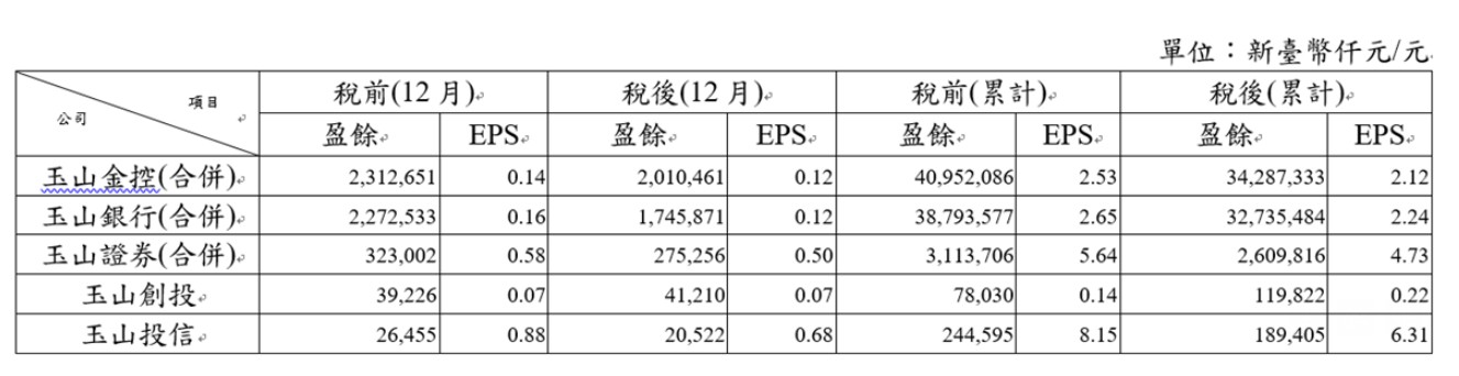 玉山金2025年12月自結盈餘率先出爐,單月稅後盈餘20.1億元,累計全年稅後盈餘342.9億元,創歷年同期獲利最高,年增31.5%, EPS為2.12元,股東權益報酬率(ROE)為13%,均為歷年最高紀錄。