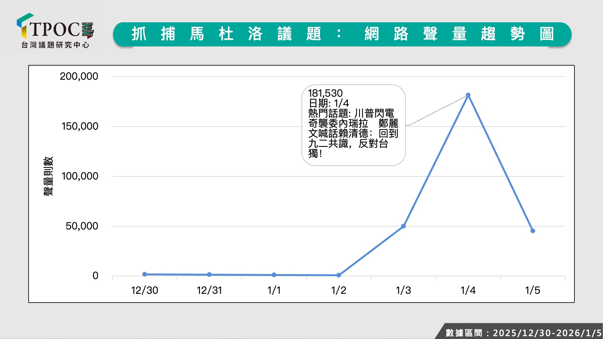 為深入瞭解台灣網友們究竟如何看待此事件,TPOC台灣議題研究中心透過QuickseeK快析輿情資料庫,蒐集2025年12月30日至2026年1月5日之間的網路輿情數據,結果發現,1月3日馬杜洛被抓捕當天,單日「抓捕馬杜羅」相關聲量飆破4.9萬則。不過真正引發全面討論的,是1月5日各界陸續發表評論之後、鄭麗文藉此公開呼籲賴清德「回到九二共識,反對台獨」,網友們也將馬杜洛的處境投射到台灣領導人身上,使這則國際新聞與國內政治脈絡聯動,引發激烈論戰,成為熱門話題,單日相關聲量衝高至超過18.1萬則。直到1月5日,網友們討論焦點轉向「美國這麼做合法嗎?」等關於法理層面的探討,單日相關聲量仍有超過4.5萬則。