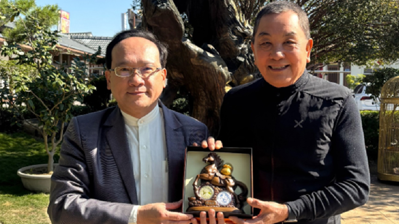 ↑圖說:名門易理楊登嵙教授與竹山鎮紫南宮主委莊秋安手持2026年馬年錢母套幣。(圖片來源:楊登嵙 教授提供)