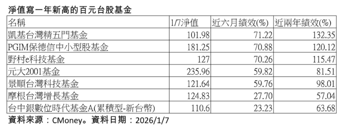 台股頻創新高,台股基金也跟著衝高,截至7日為止,淨值創近一年新高有29檔,範圍涵蓋科技類、一般股票型、中小型、上櫃股票型、價值型;基金淨值達百元的共7檔,包括凱基台灣精五門基金、PGIM保德信中小型股基金、野村e科技基金、元大2001基金、景順台灣科技基金、摩根台灣增長基金,以及台中銀數位時代基金A(累積型-新台幣)。