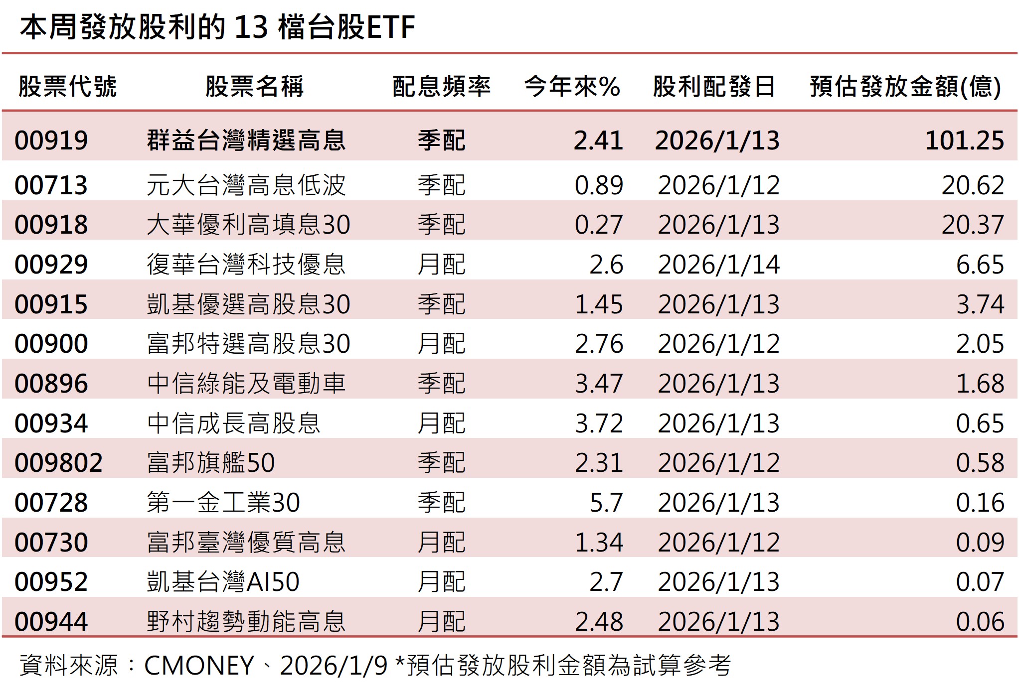 本週是1月台股ETF股利發放高峰期,總計有13檔發放預估逾157.98億元股利,預估共有301.5萬位受益人受惠。