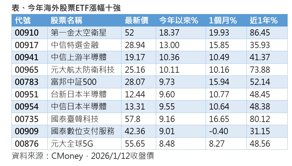 海外ETF也是強者恆強,像是第一金太空衛星ETF(00910)收盤價52元,上漲3.79%,2026年短短7個交易日,累計漲幅逾18%,不僅在海外股票ETF表現位居首位,更在全台317檔掛牌ETF不分類型名列第一。