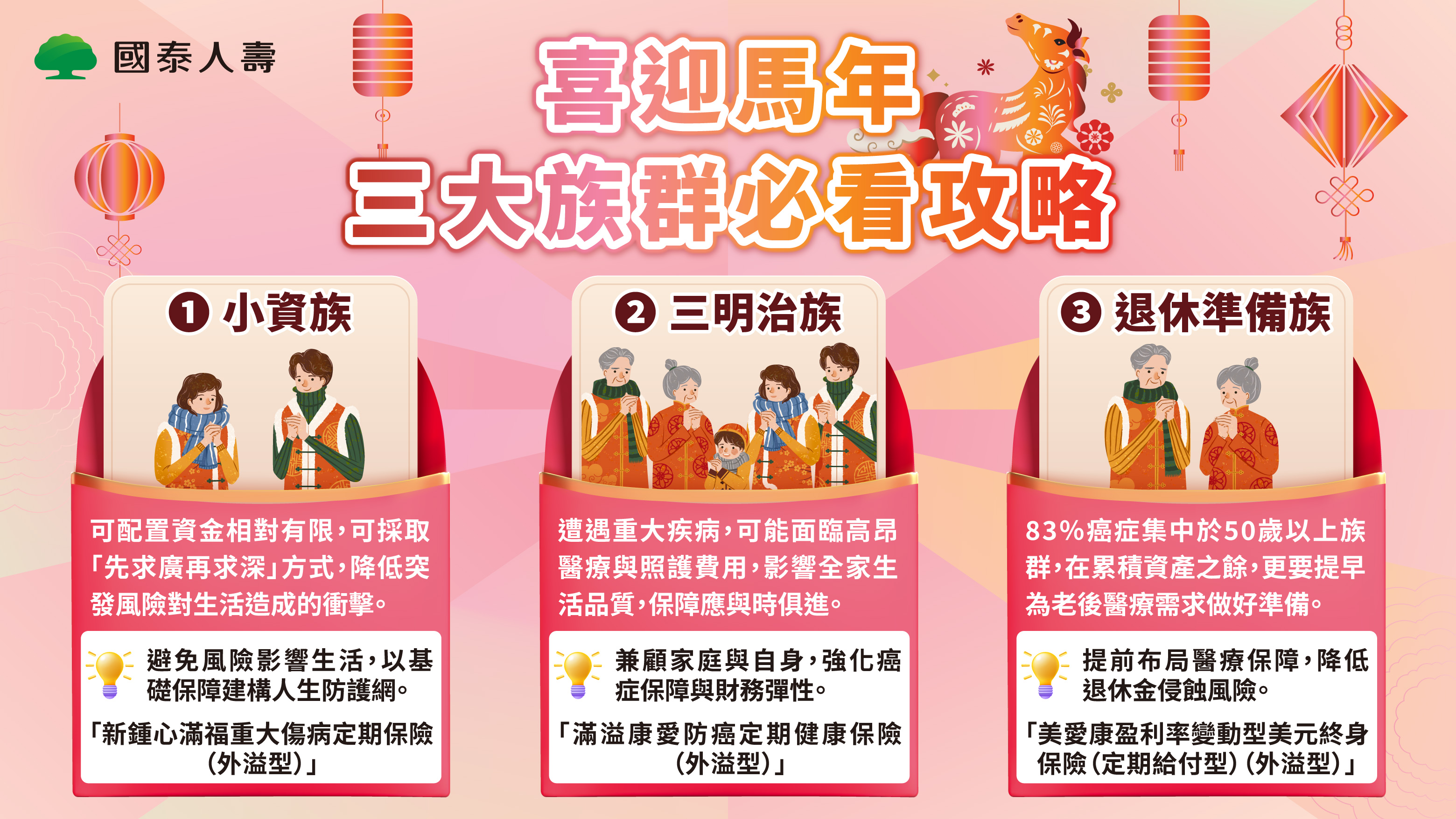 農曆春節將近,國泰人壽提醒民眾適時盤點自身與家人的保單,確認保障內容符合當下及未來需求,例如剛踏入職場的新鮮人、成立家庭的族群,或邁入退休生活的長者。除了善用「333原則」,將收入或獎金的3分之1投入保障規劃外,國壽依據不同人生階段的需求,提供3大族群保單檢視攻略。