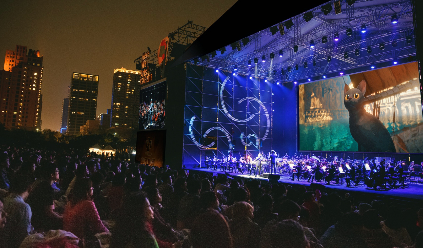 ↑圖說:《喵的奇幻漂流》登上高美館草坡巨型螢幕,搭配高雄市交響樂團的現場震撼樂音,帶來最純粹的感動! (圖片來源:高雄春天藝術節/財團法人高雄市愛樂文化藝術基金會提供)