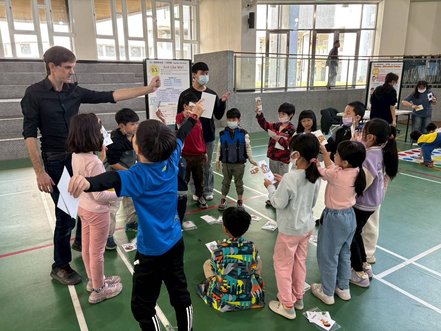 河堤國小校長杜昌霖表示,此次活動依據不同年段學生的發展需求,精心設計多元且循序漸進的學習內容,透過遊戲、角色扮演、情境對話與闖關體驗,引導學生學習辨識情緒、表達感受,並在互動中練習傾聽與尊重。孩子們在「做中學、說中學」的歷程中,不僅提升英語學習動機,更深化對自我與他人的理解。