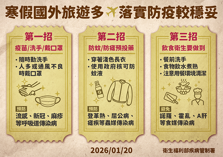 除了施打疫苗,疾管署提出寒假防疫3招,至國外旅遊時,應勤洗手、戴上口罩,做好個人防疫措施。如至登革熱疫區,應積極防蚊,選擇淺色衣服,出發前經醫師評估,服用瘧疾預防性投藥。飲食衛生更是馬虎不得,切記餐前洗手、食物需煮熟,並注意用餐環境是否乾淨整潔。
