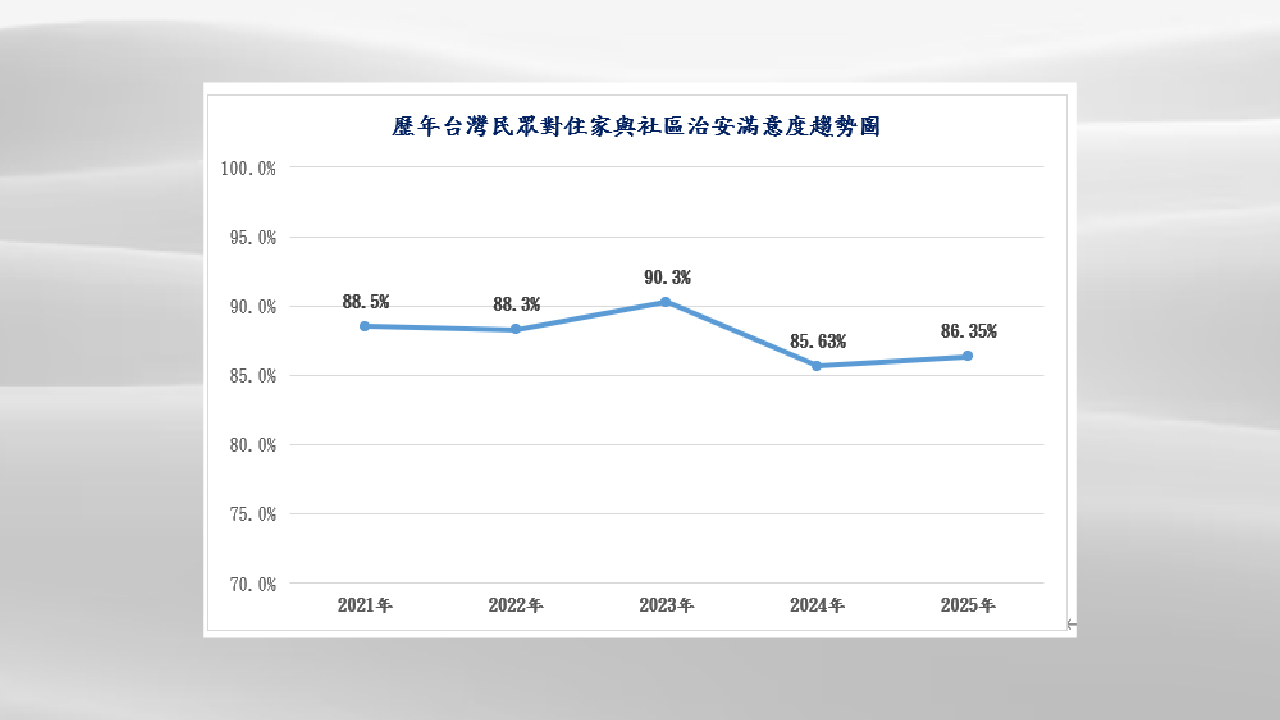 本次調查結果發現,在「住家與社區治安狀況的觀感」上,86.35%的民眾感覺住家附近安全,多數民眾對於自家附近安全度表示具有相當之信心與肯定,整體居家或社區治安滿意度達八成六之正向評價。然而,對整體治安狀況之觀感有48.56%的民眾認為當前治安良好;以近三年整體觀察皆呈現穩定正向評價,顯示出國民對於落實公共安全之評價給予肯定。