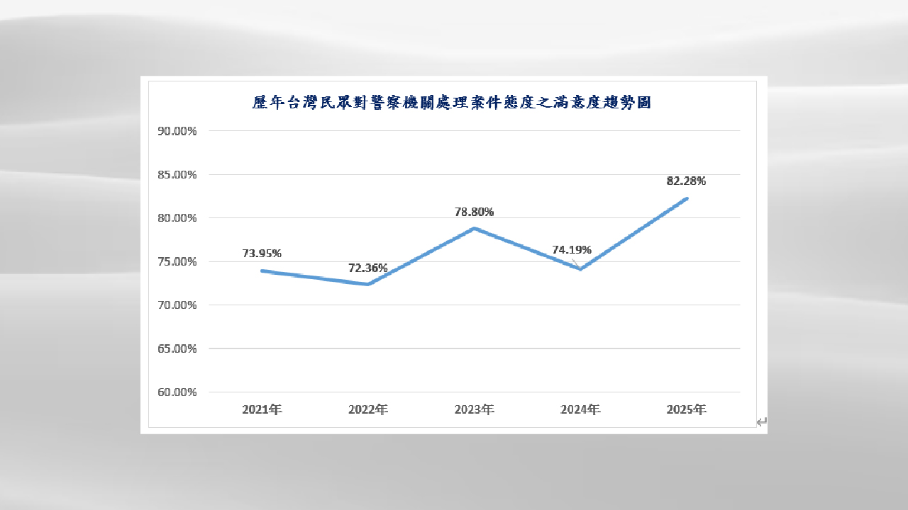 本次調查發現,民眾對「警察維護治安工作」的滿意度為78.72%,近七成九之民眾肯定警察人員在工作上的專業表現。根據近三年之調查結果顯示,「警察維護治安工作」的滿意度均維持在七成五以上;於此同時,針對第一線警察人員之表現,有82.28%之民眾對警察機關處理民眾案件或求助電話時之態度表達滿意,相較於去年(113年)之滿意度大幅提升8.1%(74.18%→82.28%),顯示臺灣民眾在今年給予警察機關高度肯定。