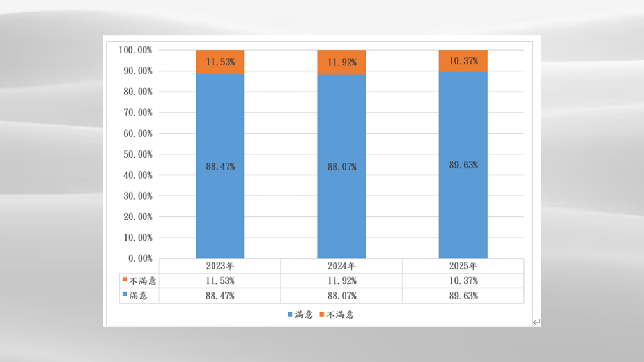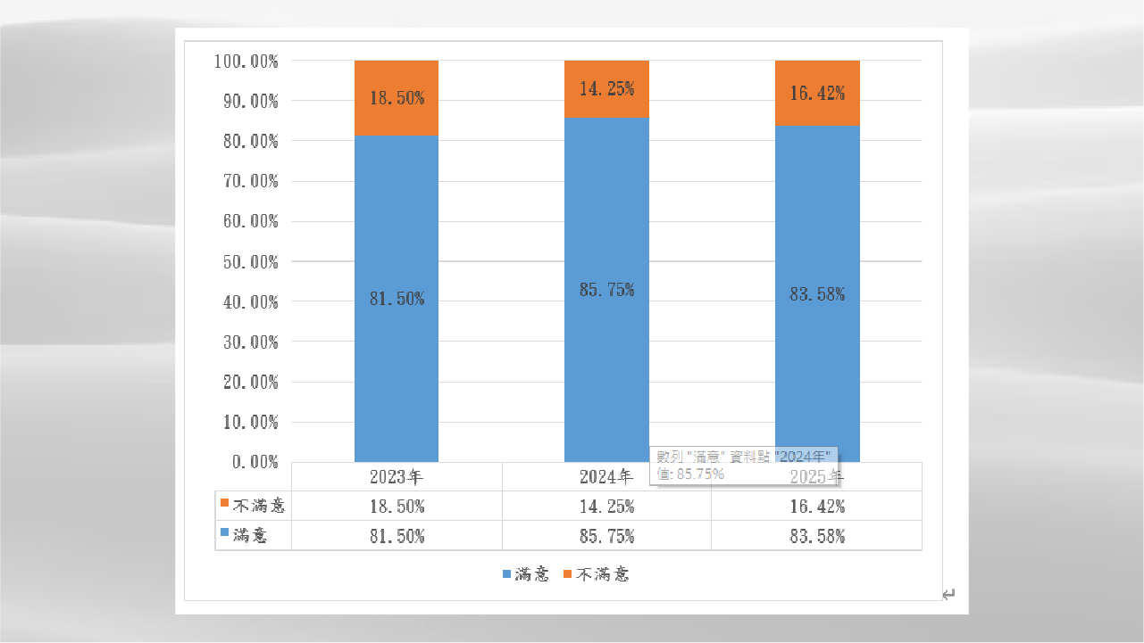 依歷年趨勢圖可知,近兩年皆有如此近九成之滿意度反映出警方在保障民眾交通安全方面所付出的努力,得到社會廣泛支持與肯定,總體上滿意度仍然保持在高位。