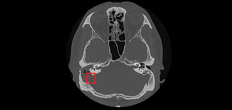 ▲紅框處可見與後顱窩相隔的骨板被膽脂瘤侵蝕。(圖/台北慈濟醫院提供)