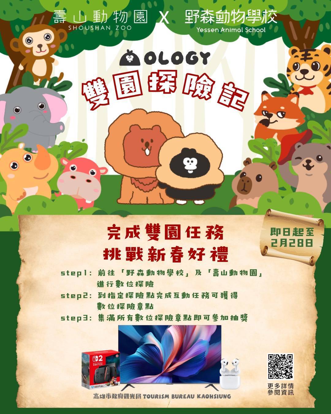 此外,百萬人氣插圖角色「掰掰啾啾奧樂雞」2月首度跨足動物園區,擔任探險隊長,帶領民眾走訪壽山動物園與野森動物學校,展開期間限定的「雙園探險記」。活動結合數位互動任務與抽獎機制,獎品涵蓋55吋QLED電視、Switch與AirPods等,總價值超過10萬元,讓親子在遊園同時也能享受闖關與抽獎樂趣。