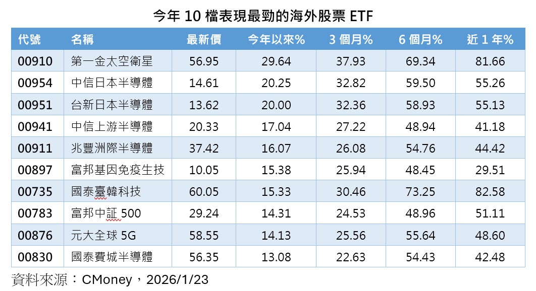 全球股市持續上攻,聚焦太空衛星、半導體與科技主題的海外股票ETF,績效也一馬當先,統計今年以來績效最佳的10檔,漲幅13%起跳,幾乎都是鎖定上述主題。其中,第一金太空衛星ETF(00910)漲幅逼近3成,表現最猛。