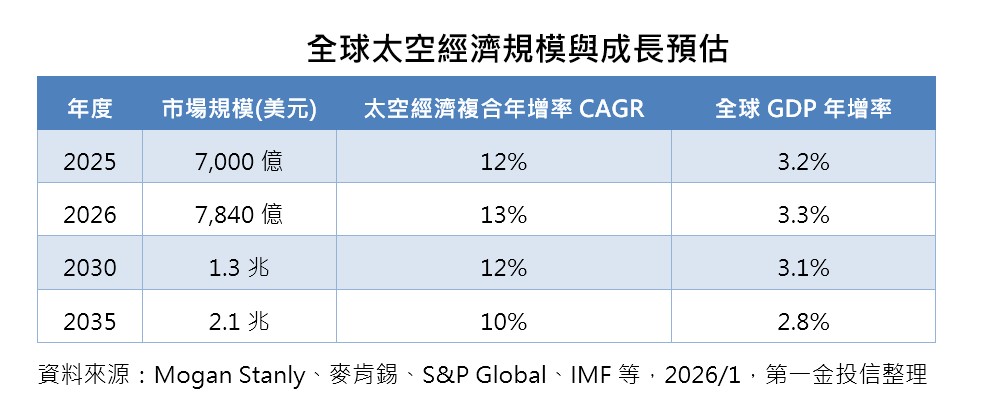Solactive統計,太空衛星指數今年以來已強勁上揚25%,超越今年強漲的韓股、陸股、台股,及費城半導體指數,第一金投信指出,太空衛星指數漲勢已延續至第三年,今年的表現已從前幾年的「夢想題材」,進一步發展至有「訂單引擎」的實質驅動力,太空衛星產業將步入商業兌現階段,未來10年市場規模7000億美元,擴大至超過2兆美元,複合成長率最高可達13%,成長動能超越全球經濟表現。