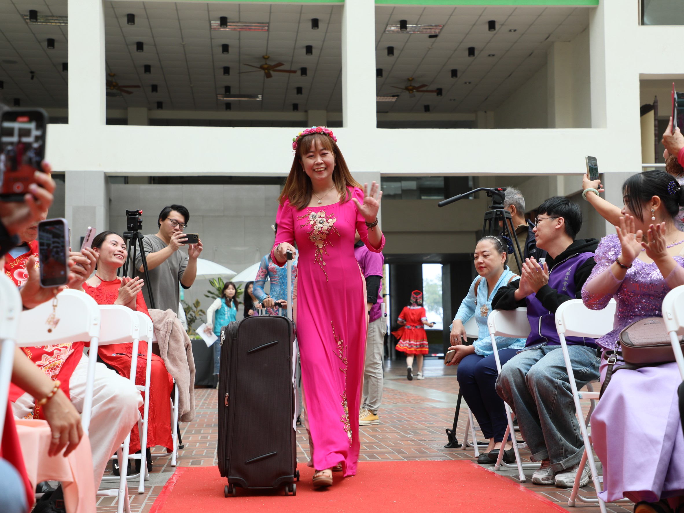 ↑圖說:新住民姊妹,手拉行李箱緩步登場,以身體敘事呈現「離鄉、扎根、共築新家」的生命歷程。(圖片來源:嘉義縣社會局提供)