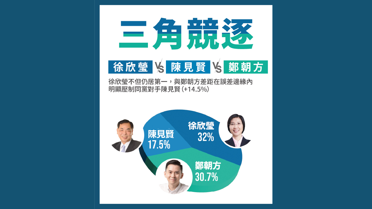 更貼近實戰的三人同場競逐情境,同樣值得關注。民調顯示,在徐欣瑩、陳見賢與鄭朝方三人之中,徐以32.0%支持度居於首位,鄭朝方30.7%緊追其後,陳見賢則為17.5%。分析指出,若藍營未能完成整合,恐將出現選票分流、讓綠營坐收漁利的風險;然而在藍票尚未集中前,徐仍能守住第一,顯示其基本盤較為穩固,也具備一定吸納中間選民的能力。
