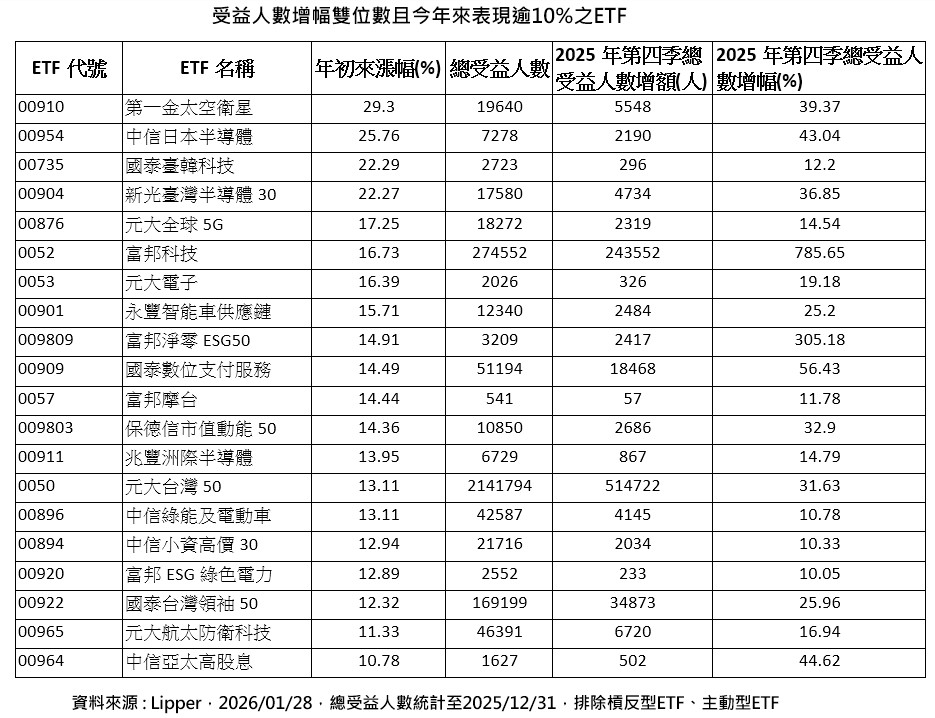 統計2025年第四季總受益人數增幅超過雙位數,且ETF今年來漲幅超過10%的ETF(不含槓反型、主動型)共有20檔,其中以半導體、科技相關主題型ETF表現最出色。